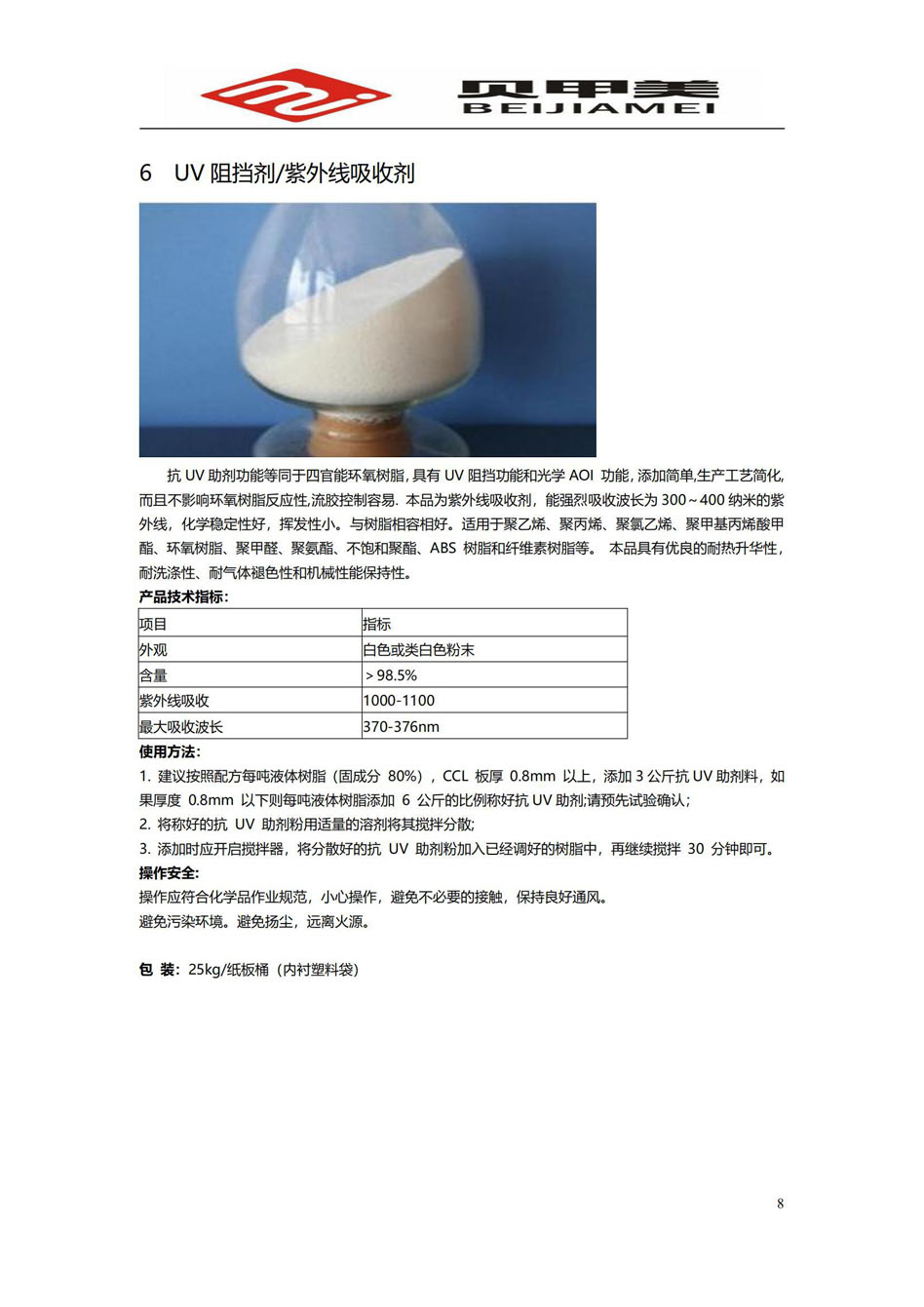 簡(jiǎn)述: 抗UV助劑功能等同于四官能環(huán)氧樹(shù)脂,具有UV阻擋功能和光學(xué)AOI 功能,添加簡(jiǎn)單,生產(chǎn)工藝簡(jiǎn)化,而且不影響環(huán)氧樹(shù)脂反應(yīng)性,流膠控制容易. 本品為紫外線吸收劑,能強(qiáng)烈吸收波長(zhǎng)為300~400納米的紫外線,化學(xué)穩(wěn)定性好,揮發(fā)性小。與樹(shù)脂相容相好。適用于聚乙烯、聚丙烯、聚氯乙烯、聚甲基丙烯酸甲酯、環(huán)氧樹(shù)脂、聚甲醛、聚氨酯、不飽和聚酯、ABS 樹(shù)脂和纖維素樹(shù)脂等。 本品具有優(yōu)良的耐熱升華性,耐洗滌性、耐氣體褪色性和機(jī)械性能保持性。