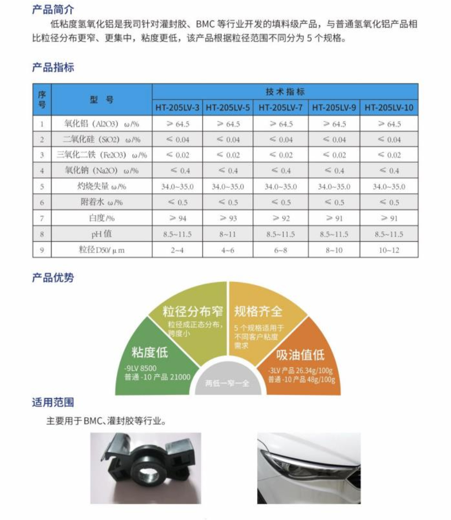 低粘度氫氧化鋁是我司針對灌封膠、BMC等行業(yè)開發(fā)的調料級產(chǎn)品,與普通氫氧化鋁產(chǎn)品相比粒徑分布更窄、更基重,年度更低,該產(chǎn)品根據(jù)粒徑范圍不同分為5個規(guī)格。